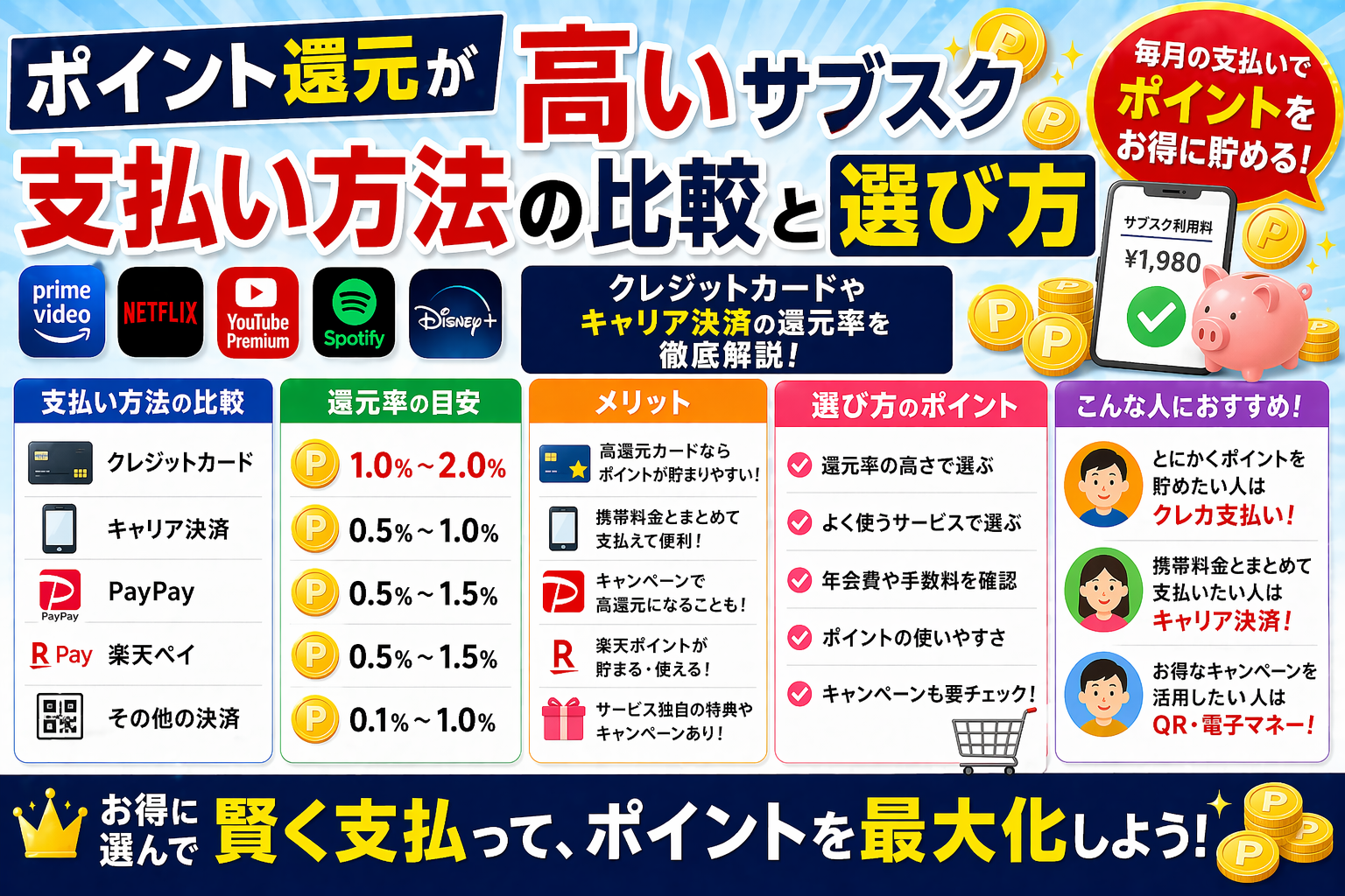 そこで本記事では、【2026年最新】のポイント還元率動向と共に、主要サブスクサービス別の「本当にお得な支払い方法」を徹底比較。クレジットカード、キャリア決済、PayPay、コンビニ払いそれぞれのメリット・デメリットから、年間獲得ポイントのシミュレーションまで、すぐに実践できるノウハウをご紹介します。